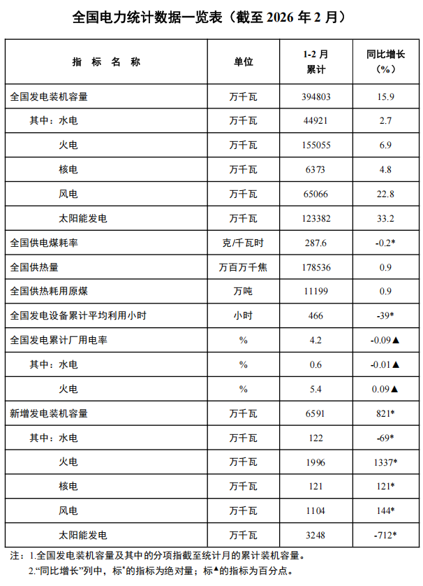 3月25日,国家能源局发布2026年1-2月份全国电力统计数据。